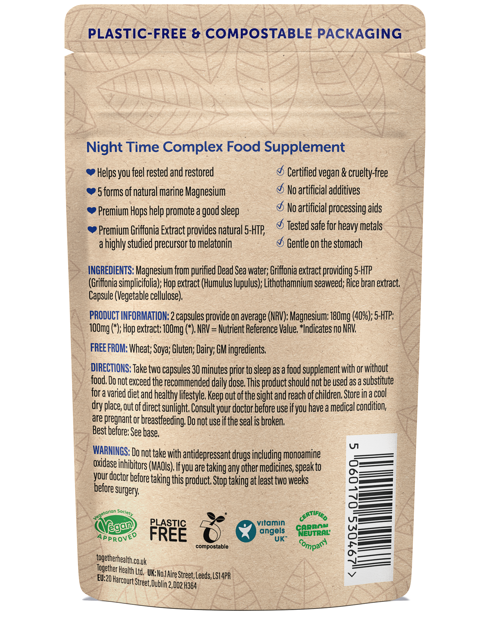 Directions for Use: Take two capsules 30 minutes prior to sleep as a food supplement with or without food. Do not exceed the recommended daily dose. This product should not be used as a substitute for a varied diet and healthy lifestyle. Keep out of the sight and reach of children. Store in a cool dry place, out of direct sunlight. Consult your doctor before use if you have a medical condition, are pregnant or breastfeeding. Do not use if the seal is broken. Best before: See base.